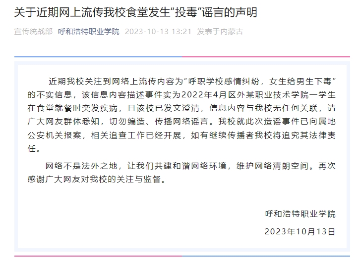 【典型案例】自10月初,連續(xù)有網(wǎng)民在社交媒體發(fā)視頻稱,呼和浩特職業(yè)學院發(fā)生悲劇,一名男生因感情糾紛被女生下毒致死,引發(fā)社會關(guān)注。10月13日,該校發(fā)布了一份聲明,澄清這條信息不實,與學校無任何關(guān)聯(lián)。據(jù)悉,網(wǎng)絡流傳的視頻中描述的事件實為2022年4月江蘇南京交通職業(yè)技術(shù)學院一學生在食堂就餐時突發(fā)疾病 ,并非因為女生下毒。而且,江蘇南京交通職業(yè)技術(shù)學院在當時就已經(jīng)發(fā)布了相關(guān)澄清。再如,10月18日,網(wǎng)傳江蘇南京有男子在酒吧外性侵一名醉酒女子。當日,事發(fā)地所屬南京市警方相關(guān)工作人員回應稱,警方已查清此事,沒有性侵,網(wǎng)傳情況有夸大成分。另據(jù)警方透露,某社交網(wǎng)站流傳的不實消息,“是專門的AI軟件寫的”。