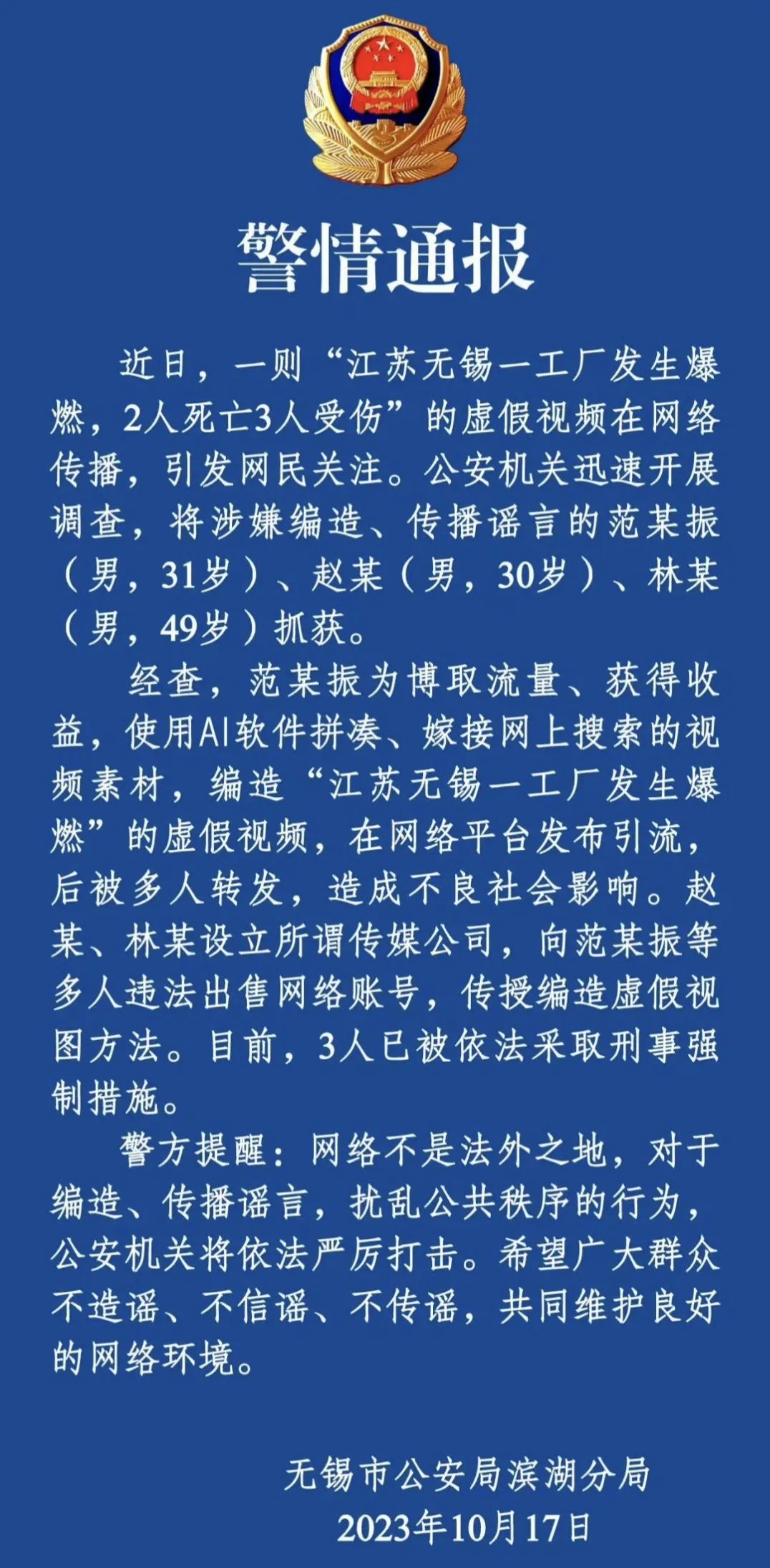 【典型案例】10月17日,一則“江蘇無錫一工廠發(fā)生爆燃,2人死亡3人受傷”的虛假視頻在網(wǎng)絡傳播,引發(fā)網(wǎng)民關(guān)注。當日20時許,無錫市公安局濱湖分局微信公眾號“濱湖警事”發(fā)布警情通報,稱此為一起謠言事件,已經(jīng)將造謠、傳謠的范某、趙某、林某三人抓獲。經(jīng)查,范某為博取流量、獲得收益,使用AI軟件拼湊、嫁接網(wǎng)上搜索的視頻素材,編造相關(guān)虛假視頻,在網(wǎng)絡平臺發(fā)布引流,后被多人轉(zhuǎn)發(fā),造成不良社會影響。趙某、林某設(shè)立所謂傳媒公司,向范某等多人違法出售網(wǎng)絡賬號,傳授編造虛假視圖方法。