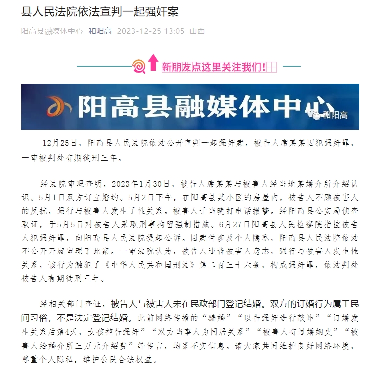 2023年12月25日13時許,陽高縣融媒體中心微信公眾號“和陽高”通報此案審理情況。通報指出,經(jīng)法院審理查明,2023年1月30日,被告人與被害人經(jīng)當(dāng)?shù)啬郴榻樗榻B認(rèn)識。5月1日雙方訂立婚約。5月2日下午,在陽高縣某小區(qū)的房屋內(nèi),被告人不顧被害人反抗,強(qiáng)行與被害人發(fā)生了性關(guān)系。被害人于當(dāng)晚打電話報警。經(jīng)陽高縣公安局偵查取證,于5月5日對被告人采取刑事拘留強(qiáng)制措施。經(jīng)相關(guān)部門查證,被告人與被害人未在民政部門登記結(jié)婚。雙方的訂婚行為屬于民間習(xí)俗,不是法定登記結(jié)婚。此前,此前網(wǎng)絡(luò)傳播的“騙婚”“以告強(qiáng)奸進(jìn)行敲詐”等多個傳言,均系不實(shí)信息。這一通報初步回應(yīng)了多個輿論關(guān)切點(diǎn),網(wǎng)民觀點(diǎn)開始出現(xiàn)扭轉(zhuǎn),部分網(wǎng)民指出訂婚不等于同意發(fā)生性關(guān)系。