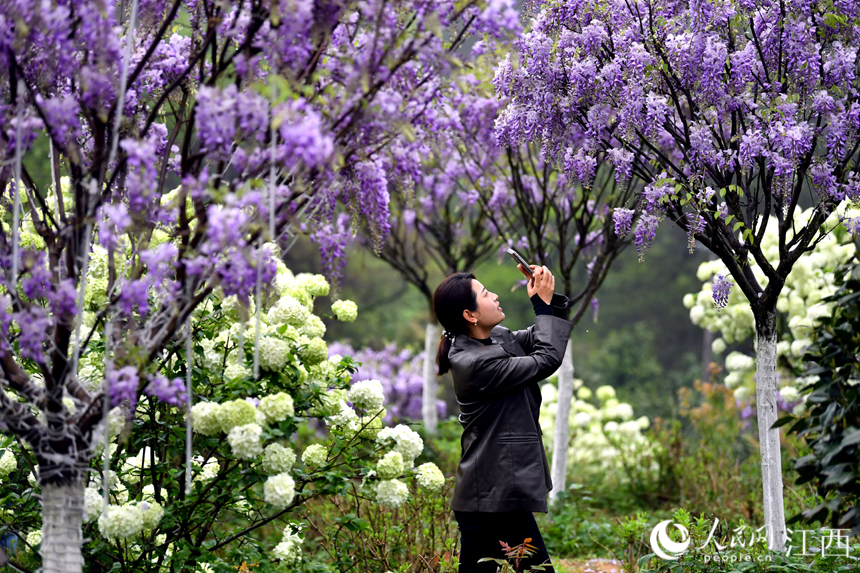 4月6日,江西省上饒市廣豐區(qū)大南鎮(zhèn)新塘的中華木繡球博覽園里游客如織,當前,正值木繡球的盛開期,白的如雪、綠的如玉,加上紫藤、茶梅的襯托,整個博覽園顯得清新淡雅,游客們徜徉其中賞花打卡,好不自在。