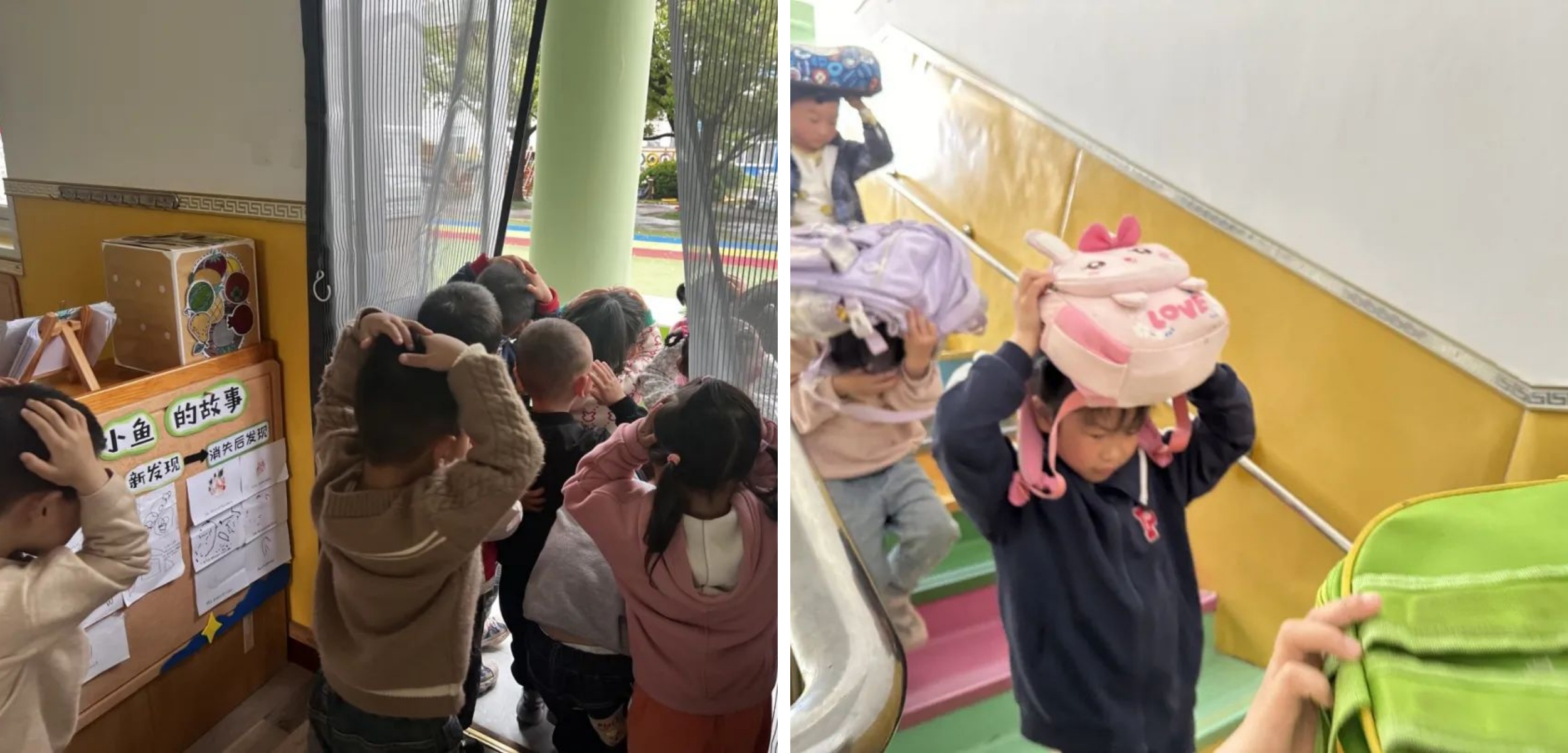 地震間隙,“警報解除”鈴聲響起,各班幼兒在老師的帶領下,按照指定逃生路線有序撤離至操場。孩子們聽從老師指揮,用手護住頭部,弓著腰,緊急有序地迅速撤離危險地帶。孩子們撤離時不推拉、不沖撞、不擁擠。