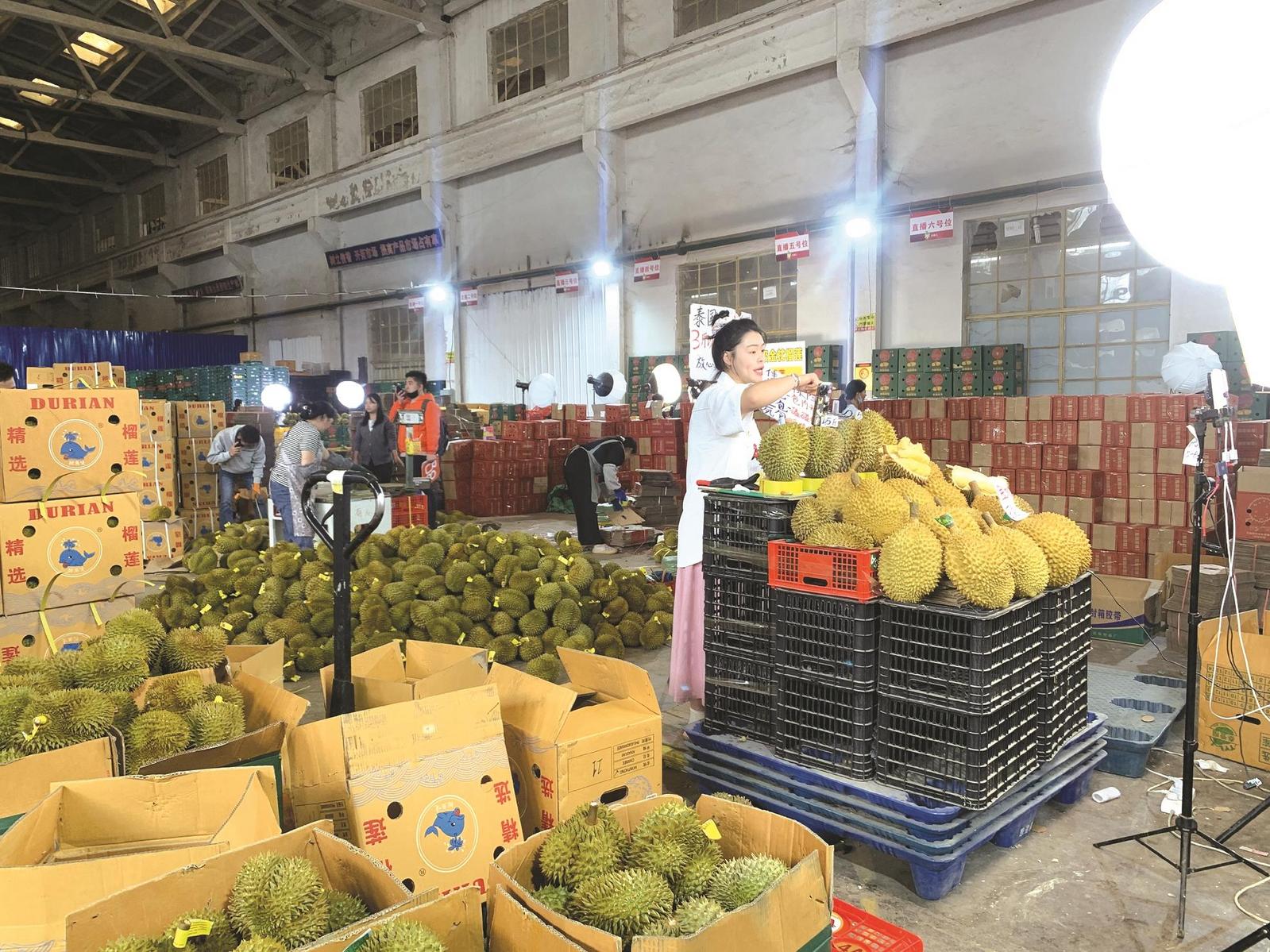 5月初的一個上午,記者在云南思珺兒生鮮供應(yīng)鏈基地看到,一筐筐沃柑、藍(lán)莓、人參果,以及從泰國運來的榴蓮、山竹堆滿了倉庫,散發(fā)出濃濃果香。而在卸貨區(qū)的另一側(cè),分出了眾多直播區(qū),在兩盞燈、幾部手機(jī)前,一位主播正情緒飽滿地向屏幕前的粉絲介紹果品、釋疑解惑,一個個直播的小天地外,選果、打包更是一派繁忙景象。