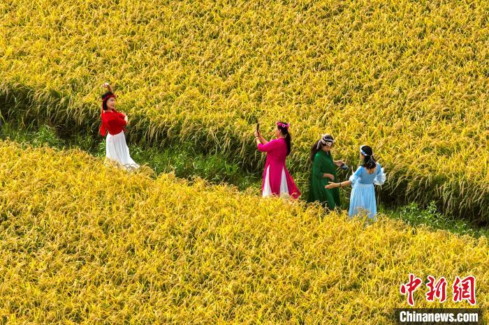 三合村水稻豐收的季節(jié),金黃色的稻穗吸引游客合影拍照 包寶音德力格爾 攝