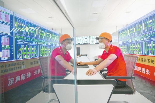 湖南生平米業(yè)股份有限公司的工作人員通過遠(yuǎn)程智能化自動(dòng)生產(chǎn)大米 記者 郭立亮 攝
