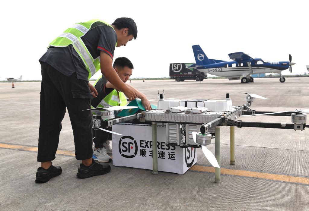 6月28日,工作人員將貴陽(yáng)特色農(nóng)產(chǎn)品快遞裝進(jìn)無人機(jī) 記者 劉坤 攝