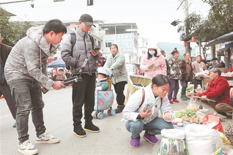 人群中,“鄉(xiāng)村琴妹”村播團隊引人注目。他們分工明確,一個負責解說,一個負責跟拍,還有一個負責上鏈接。