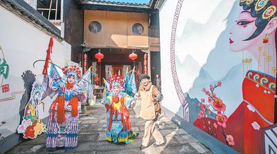 在浙江省金華市鄭店村婺劇非遺主題館,村劇團老師給游客指導(dǎo)婺劇基本動作。楊梅清 攝