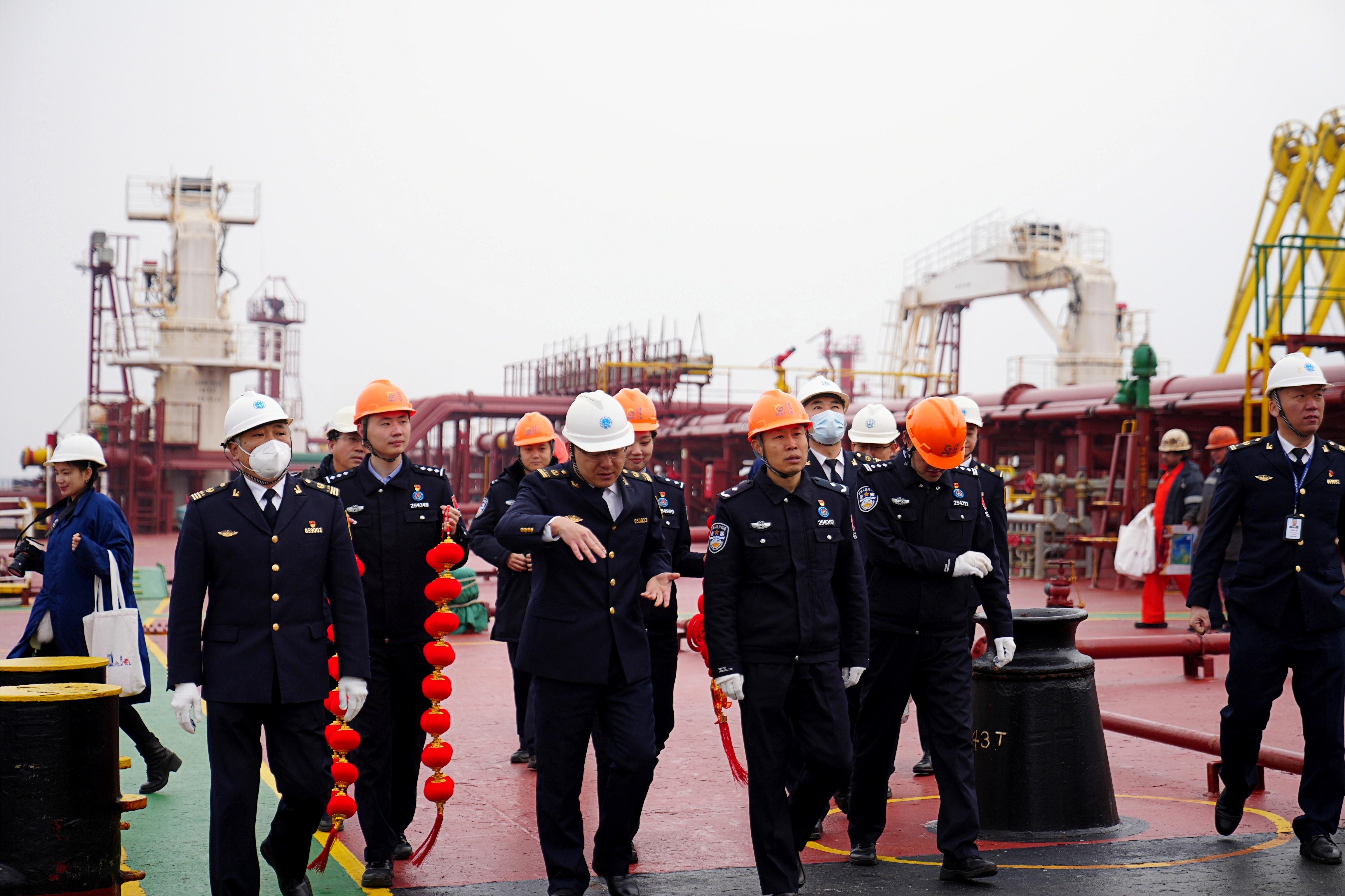 1月22日上午,筆者在董家口港區(qū)油港碼頭看到,圣瑪力諾籍油輪“海天”輪??吭诓次簧希驼丛床粩嗟赝ㄟ^(guò)管道從船上輸送到地面儲(chǔ)油罐。據(jù)了解,該輪載有9.5萬(wàn)噸原油,于半個(gè)多月前從馬來(lái)西亞駛往山東。1月21日中午,該輪靠泊董家口碼頭并開(kāi)始卸油,計(jì)劃于1月23日完貨離港。