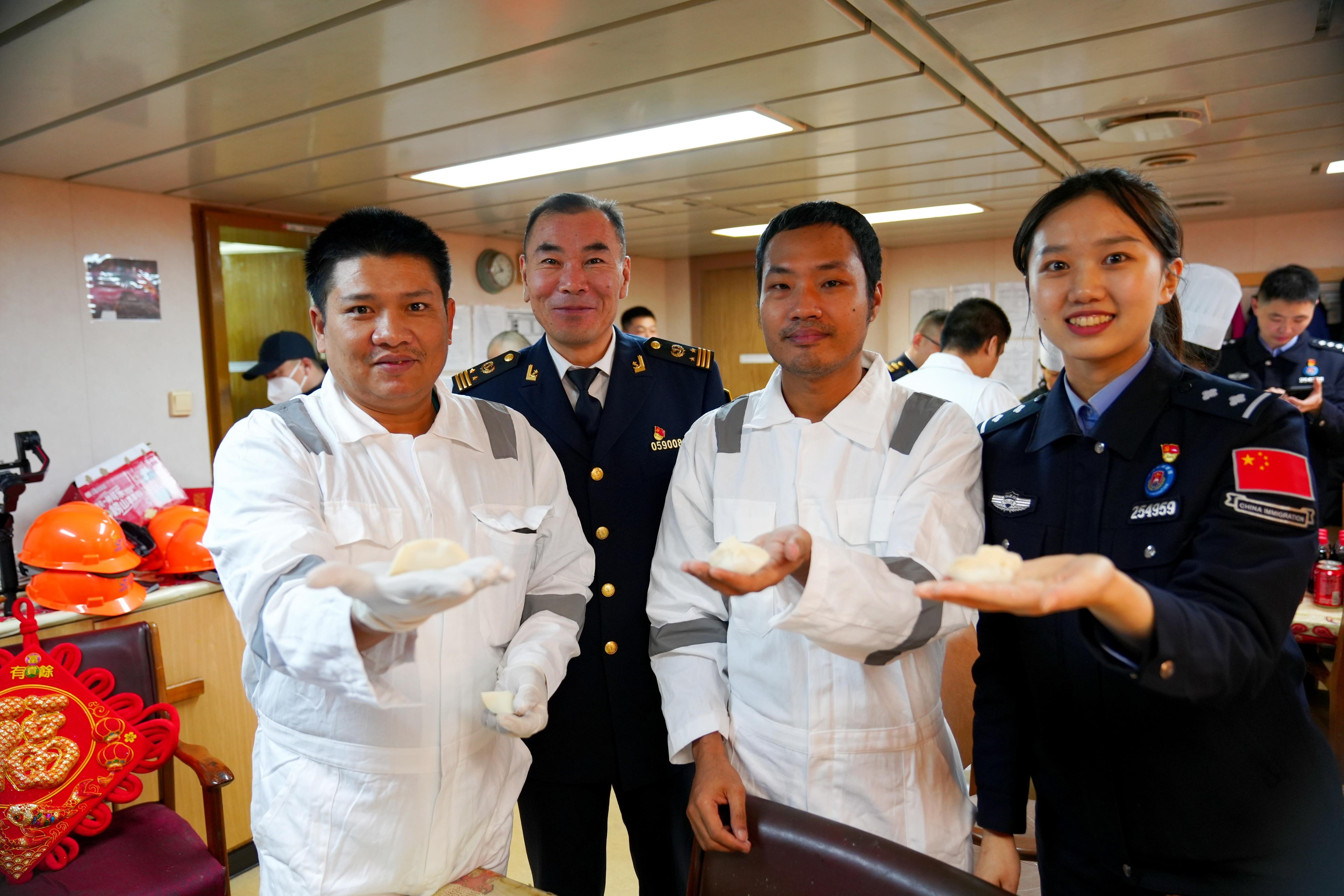 “餃子來(lái)啦!”11時(shí)30分,熱氣騰騰的餃子出鍋,中外籍船員們?cè)谝黄鹌炔患按仄穱L起來(lái)?!昂L臁陛嗇啓C(jī)長(zhǎng)豪長(zhǎng)建介紹,他在船上工作了8個(gè)多月,該輪已經(jīng)有兩個(gè)多月沒(méi)補(bǔ)充伙食了。他說(shuō),自抵達(dá)港口以來(lái),船員們都在各自的崗位上忙碌。小年這天,雖然船員們非常想吃上一頓餃子,可廚房里沒(méi)有可供制作的食材?!霸鞠牒?jiǎn)簡(jiǎn)單單湊合一頓,沒(méi)想到這么多部門(mén)組團(tuán)來(lái)給我們包餃子,心里特別溫暖?!彼f(shuō)。