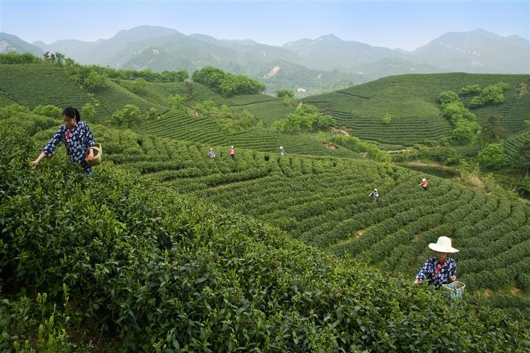 信陽(yáng)茶山,采摘春茶。