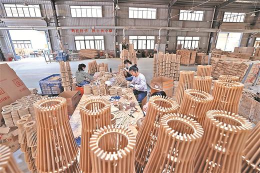 在融安縣融嘉工藝有限公司生產車間,工人正在生產竹制燈罩。記者 彭華 通訊員 譚凱興 攝