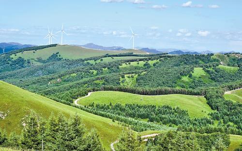 5月24日拍攝的豐寧滿族自治縣的森林和風(fēng)電場(chǎng)。記者 陳寶云 攝