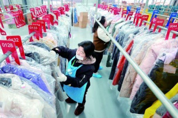 在淮北市烈山區(qū)烈山鎮(zhèn)土型社區(qū)潔風(fēng)工廠,工人正在對全國各地發(fā)來的包裹進(jìn)行分揀,“有的需要水洗,有的需要干洗,有的需要低溫洗……”工人手腳麻利,幾秒鐘便可完成一件衣服的分類。