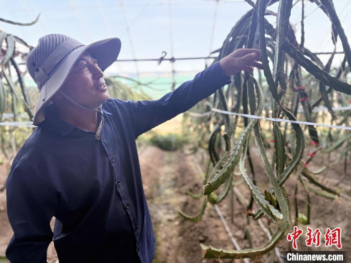韓鳳正在打理日光溫室大棚里火龍果樹。記者 張瑋 攝