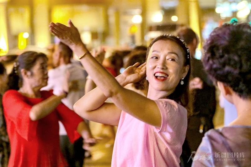 各族群眾在奇臺(tái)古城商業(yè)街旁的廣場(chǎng)上跳舞(7月4日攝)。記者 蔡增樂 攝