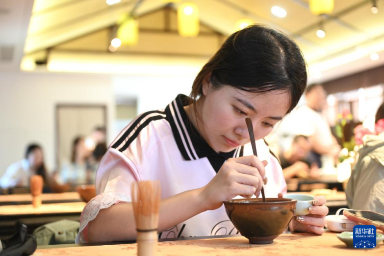 8月5日,在浙江省杭州市余杭區(qū)徑山村,一名游客體驗傳統(tǒng)點(diǎn)茶。記者 毛竹 攝