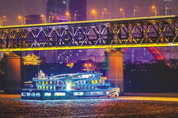 游客乘坐長(zhǎng)江榮耀號(hào)游輪欣賞江城夜景。