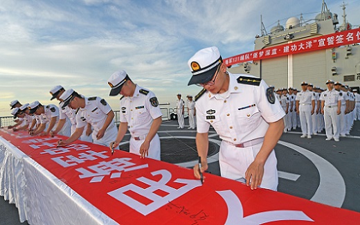 圖為護(hù)航官兵在“人民海軍忠于黨、艦行萬里不迷航”橫幅上簽名。江山 攝