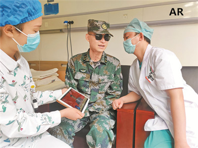 上圖:陸軍軍醫(yī)大學(xué)第一附屬醫(yī)院醫(yī)護(hù)人員與杜富國一起收聽兩會新聞。馬璽君 攝
