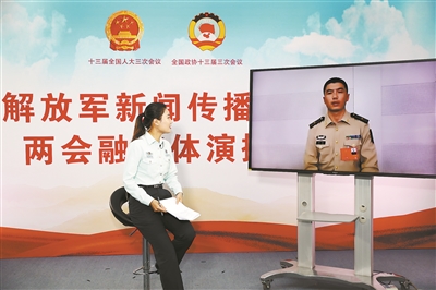 本報記者張笑語通過視頻連線方式采訪軍隊人大代表尹東。蘇鶴 攝