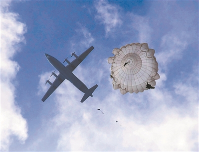 “跳!跳!跳!”綠色離機(jī)信號燈亮起,傘兵從高空躍下,直撲“作戰(zhàn)”區(qū)域。成功著陸傘兵迅速解脫傘具、整理武器裝備,在夜色掩護(hù)下向目標(biāo)地域發(fā)起沖擊。