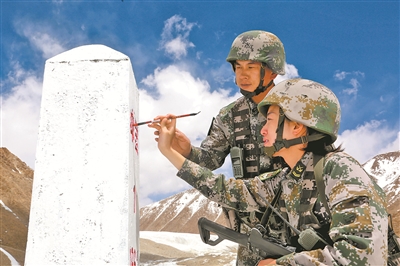 1號界碑位于雪山達坂上,道路崎嶇,常年積雪。巡邏隊伍經(jīng)過4個多小時的艱難跋涉,終于到達。站在界碑旁,官兵們面向國旗莊嚴宣誓:“我們一定會守好祖國的每一寸土地!”