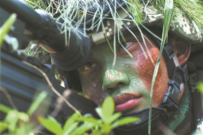 圖③:夏日炎炎,武警廣東總隊(duì)某執(zhí)勤支隊(duì)特戰(zhàn)中隊(duì)狙擊手劉欽明在叢林中潛伏。