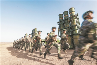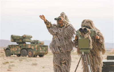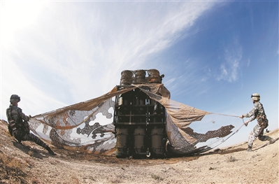 機(jī)動途中,“敵情”不斷,險象環(huán)生。官兵們克服大漠行軍風(fēng)沙漫天等不利因素,臨危不亂,沉著應(yīng)對。部隊剛剛抵達(dá)預(yù)定陣地,就接到“敵”偵察機(jī)和武裝直升機(jī)來襲的空情預(yù)警。導(dǎo)彈分隊與火炮分隊立即展開火力裝備,投入戰(zhàn)斗。