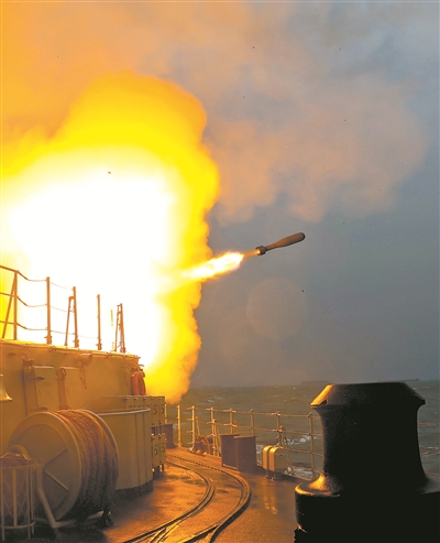 寒風(fēng)凜冽,波濤翻滾。編隊剛剛抵達訓(xùn)練海域,戰(zhàn)斗警報拉響,太原艦率先接到主炮對海射擊的命令。指揮員下達指令,火控部位密切協(xié)同,果斷擊發(fā)?;鹆Υ驌暨^后,又傳來“敵”導(dǎo)彈來襲通報。在編隊指揮所統(tǒng)一指揮下,各艦協(xié)同配合,釋放干擾彈,成功規(guī)避來襲導(dǎo)彈。