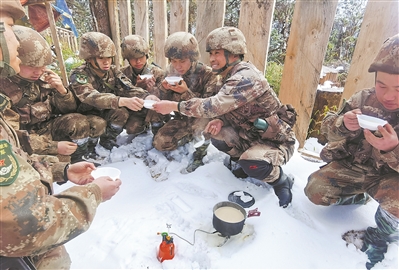 又走了4個(gè)小時(shí),夜色中到達(dá)宿營地。大家撿來一些干枯的樹枝,生火做飯。晚來天寒,官兵們頭頂塑料布擋住雨雪,身下墊著樹葉展開睡袋和衣而臥。戰(zhàn)士們睡在靠近火堆的地方,侯云則把鋪蓋搬到了最邊上。