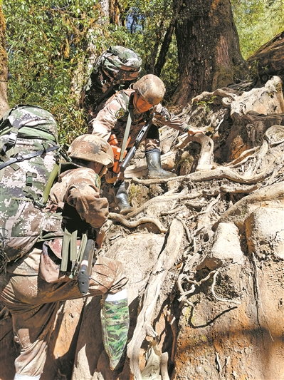 巡邏路上,會(huì)遇到很多大大小小的斷崖。每一次,侯云都先爬上去,再把戰(zhàn)士一個(gè)個(gè)拉上來。而到了危險(xiǎn)的濕滑陡坡,他會(huì)留在隊(duì)伍后面,把戰(zhàn)士一個(gè)個(gè)推上去。