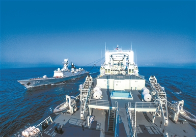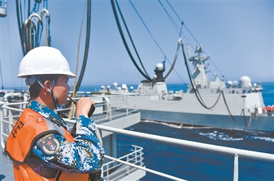 “命令你艦前往某海域,為衡水艦進行油水補給!”處置完浮雷險情,青海湖艦又接到新的命令。官兵立即調(diào)整航向,向目標(biāo)海域高速機動。抵達(dá)后,一系列海上補給作業(yè)緊張有序展開,兩艦之間凌空架起承載索,建立補給連接,順利完成補給任務(wù)。