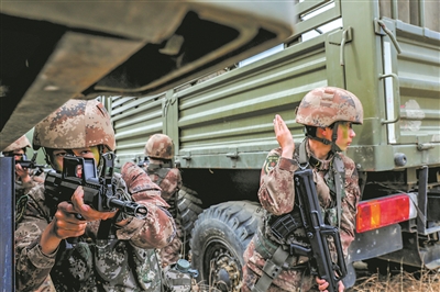 “全班注意!前方發(fā)現(xiàn)‘?dāng)场椤毖信心繕?biāo)區(qū)域態(tài)勢后,班長馮坤娜下達(dá)作戰(zhàn)命令。隨即,狙擊手快速占領(lǐng)高地,對“敵”進(jìn)行警戒;無人機操作手放飛無人機實施偵察,將相關(guān)信息實時上報指揮中心;突擊組向“敵”警戒區(qū)域隱蔽滲透……