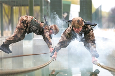 模擬戰(zhàn)場環(huán)境爬越索橋。