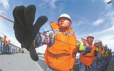 補給時,官兵觀察艦船態(tài)勢。