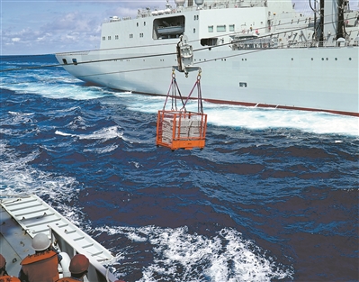 銀川艦甲板上,官兵奮力拉住查干湖艦發(fā)射的引纜,在兩艦之間架起承載索后對接輸油管線,展開油料補給。隨后,干貨補給站也開始接收補給。