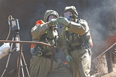 防化隊(duì)員分析泄漏物成分。