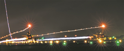 戰(zhàn)機(jī)在漆黑如墨的空中劃出一道道亮麗航線。