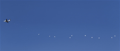抵達(dá)預(yù)定空域后,官兵接連躍出艙門。