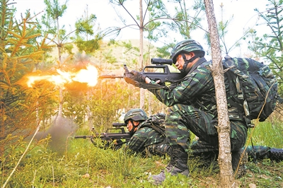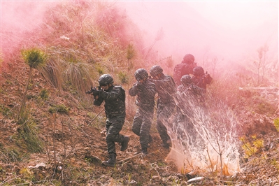 鐵拳出擊,攻勢(shì)凌厲。官兵爬陡坡、穿密林、涉水溝,將包圍圈不斷縮小?!氨┛址肿印北粐谝挥绾?,突然實(shí)施火力反抗,企圖乘亂逃竄。按照行動(dòng)預(yù)案,官兵迅速應(yīng)對(duì),從不同方向展開(kāi)圍堵,最終將“暴恐分子”悉數(shù)抓捕。