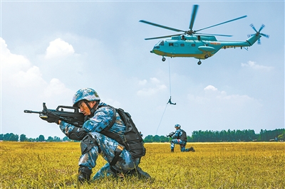懸停、開艙、滑降……戰(zhàn)機到達作戰(zhàn)地域上空后,突擊隊員迅速出艙滑降,動作一氣呵成,猶如神兵天降。落地后,在突擊組組長指揮下,隊員們密切協(xié)同,以迅雷不及掩耳之勢對“敵”發(fā)起攻擊。