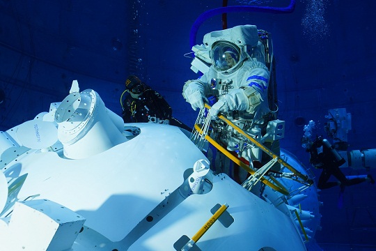圖為如臨深空—2021年8月25日翟志剛水下訓(xùn)練在機(jī)械臂上移動??追街?攝