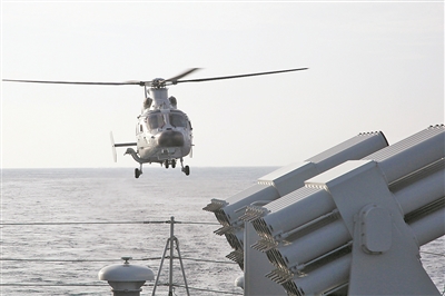 “上級通報,我海區(qū)有‘?dāng)场瘽撏Щ顒?,命我艦與直升機協(xié)同對其展開搜索與攻擊?!甭劻疃鴦?,艦機迅速進行協(xié)同訓(xùn)練。在直升機引導(dǎo)下,艦艇對水下潛艇展開有效攻擊……