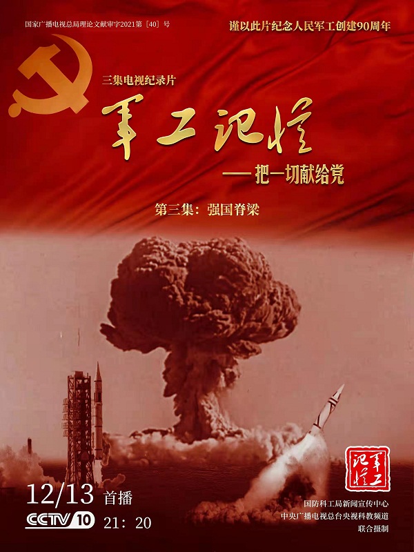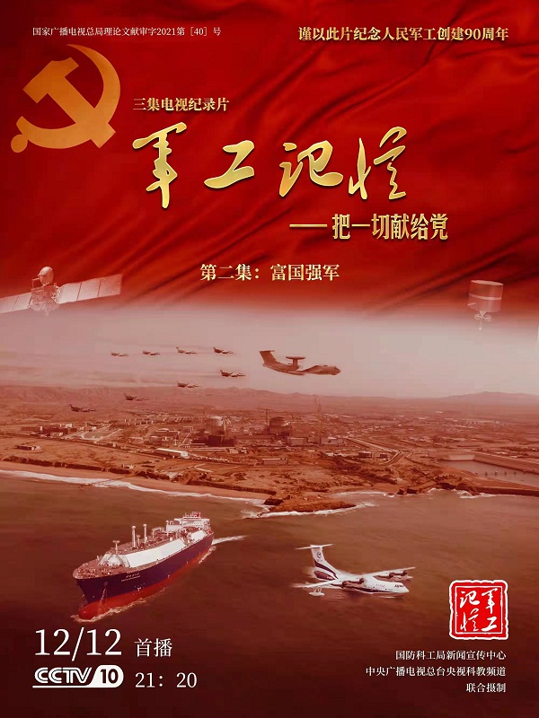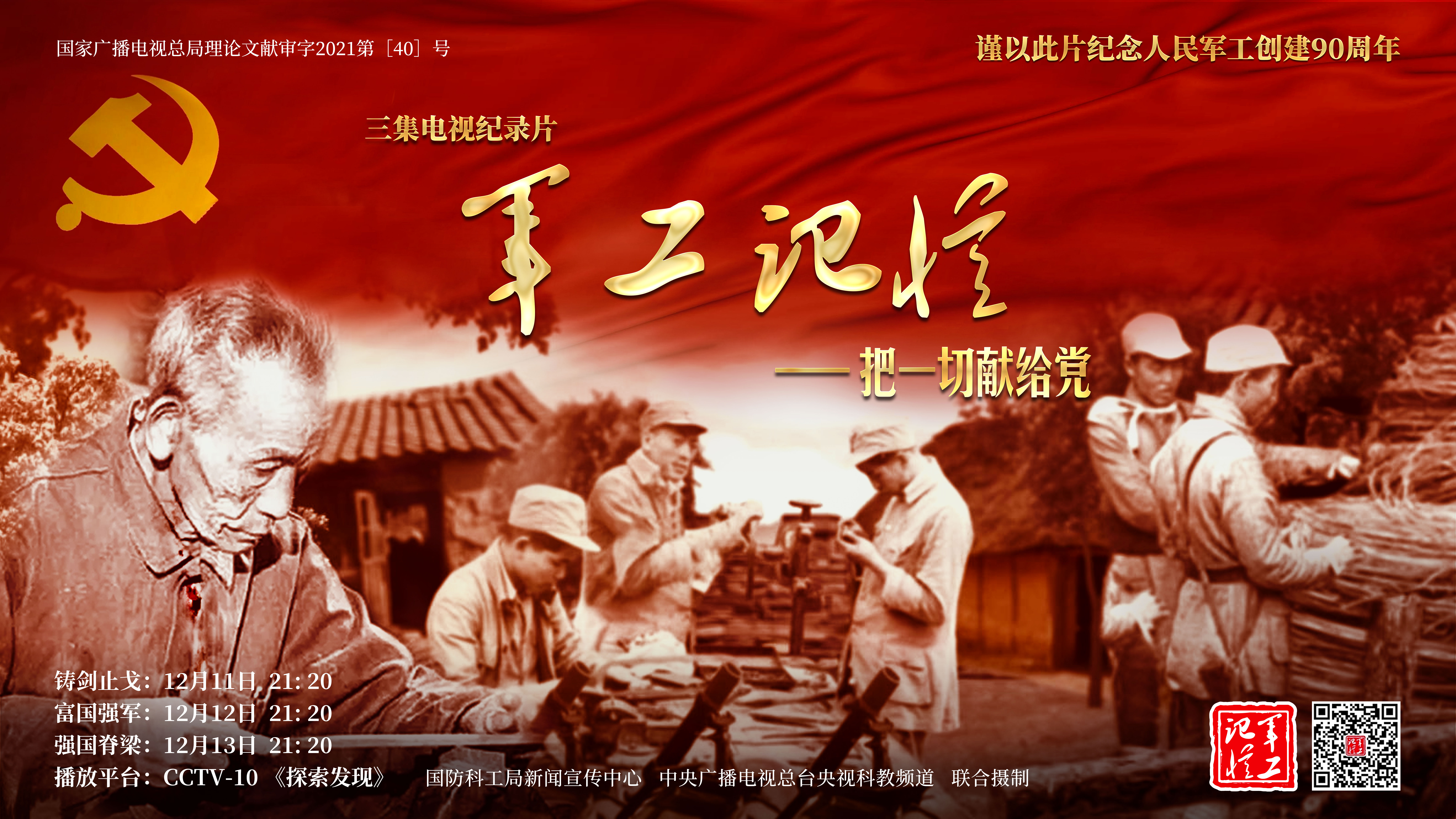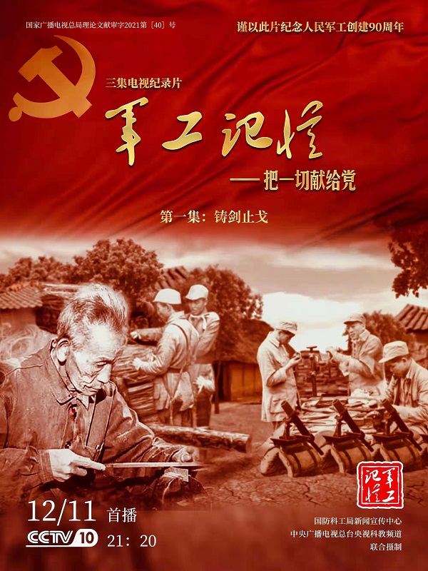為慶祝中國共產(chǎn)黨成立100周年,紀(jì)念黨領(lǐng)導(dǎo)下的人民軍工創(chuàng)建90周年,由國防科工局指導(dǎo),國防科工局新聞宣傳中心聯(lián)合中央廣播電視總臺社教節(jié)目中心攝制,各軍工集團(tuán)大力支持的3集重大理論文獻(xiàn)電視紀(jì)錄片《軍工記憶——把一切獻(xiàn)給黨》,將于12月11日21:20在央視科教頻道(CCTV-10)《探索發(fā)現(xiàn)》欄目首播,連續(xù)播出3天。該紀(jì)錄片旨在向建黨百年獻(xiàn)禮,向人民軍工90周年致敬,向全社會弘揚(yáng)軍工精神傳遞軍工文化,激勵國防科技工業(yè)戰(zhàn)線廣大干部職工不忘初心、接續(xù)奮斗,為實(shí)現(xiàn)強(qiáng)軍強(qiáng)國夢想貢獻(xiàn)力量。