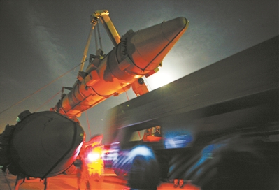 圖①:夜間吊裝導(dǎo)彈。