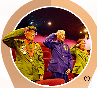 圖①:五里墩街道組織老兵觀看電影《長(zhǎng)津湖》,電影結(jié)束后,老兵起立敬禮。