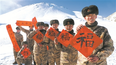 圖②:戰(zhàn)士們自寫(xiě)春聯(lián)和“福”字迎接新春佳節(jié)的到來(lái)。