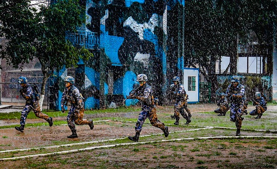 圖為突降大雨,但陸戰(zhàn)隊(duì)員士氣高昂沖鋒在前。