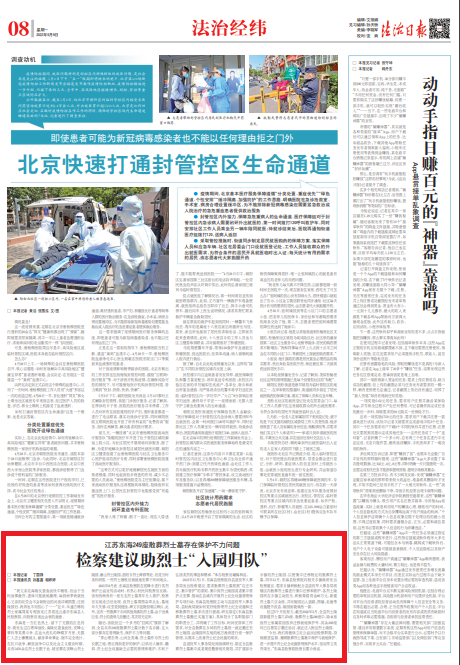 “我父親在海陵反蠶食戰(zhàn)役中犧牲,但由于當(dāng)時(shí)戰(zhàn)事激烈,遺體只能就地掩埋,每到雨季我就憂心父親的墳塋會(huì)不會(huì)被附近的河流沖刷損毀,遷到陵園后,我再也不用擔(dān)心了……”近日,年逾古稀的烈士家屬周某專程致電江蘇省連云港市東??h人民檢察院,向檢察官表達(dá)由衷的謝意。