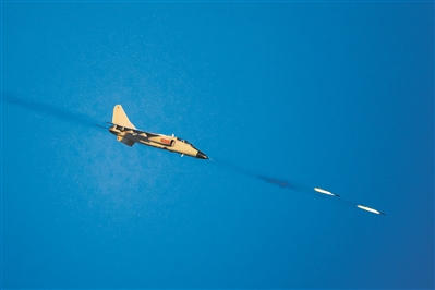 圖①:北部戰(zhàn)區(qū)海軍航空兵某旅組織戰(zhàn)術(shù)射擊訓(xùn)練,檢驗(yàn)飛行員低空機(jī)動突防能力。圖為戰(zhàn)機(jī)俯沖向目標(biāo)發(fā)射火箭彈。張?jiān)?攝